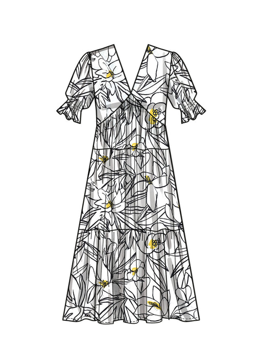 V-neck dress comes in above mid-knee to mid-calf lengths and has sleeve variations and side pockets. View A features a crochet trim on V-neckline and long sleeves gathered to self bias binding edges. View B has a ruffled hem, long sleeves with ruffles at ends, and elastic at wrists. View C is a tiered dress with short sleeves and gathered caps.
