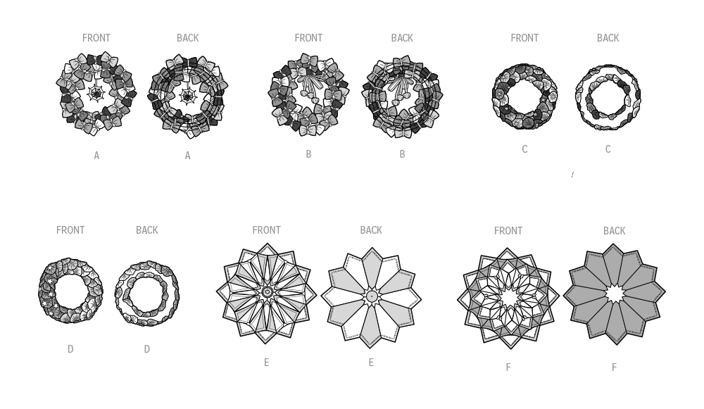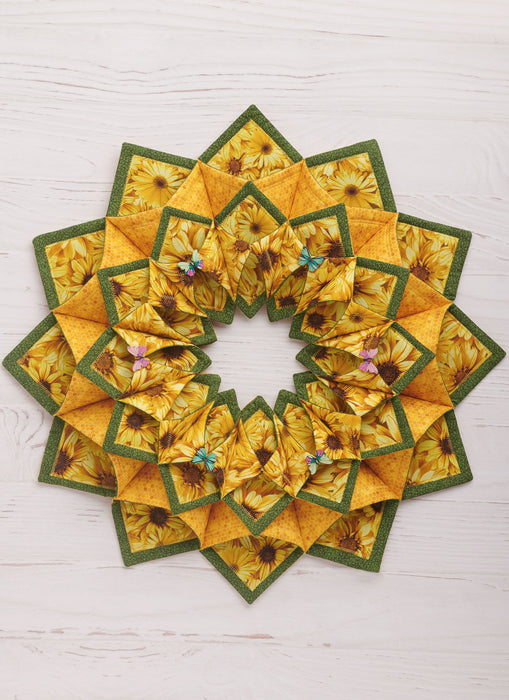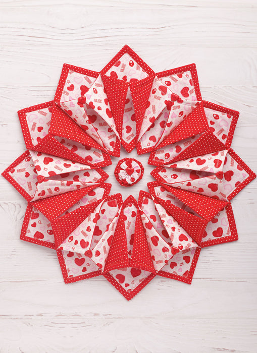 Wreaths ranging from 12" (31cm) to 21" (54cm) in diameter are designed for seasonal fabric mixing. Plush mini pillows are tied with ribbon to purchased wire wreath forms and finished with dangling accents. Yoyos are secured to form wreath forms and embellished with buttons, charms or appliques. Origami-style wreaths are folded and tacked together in sunburst shapes. See envelope for more information.