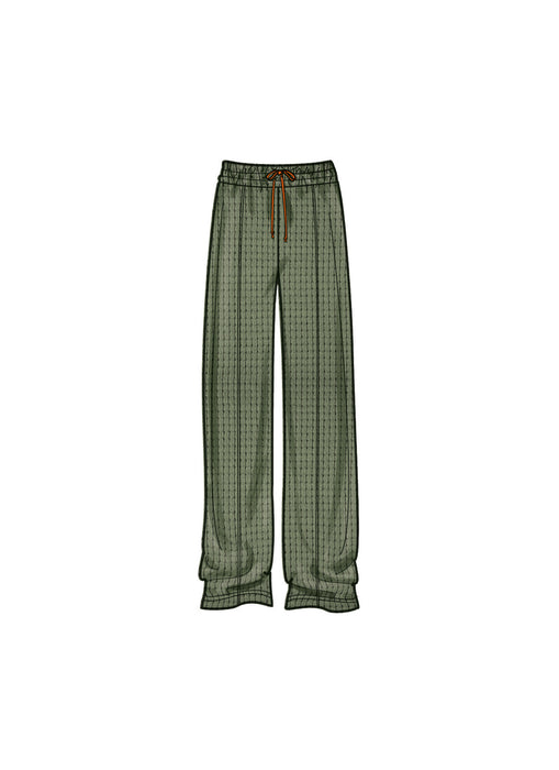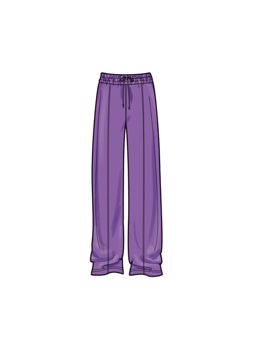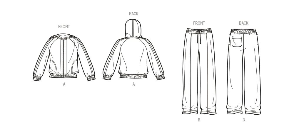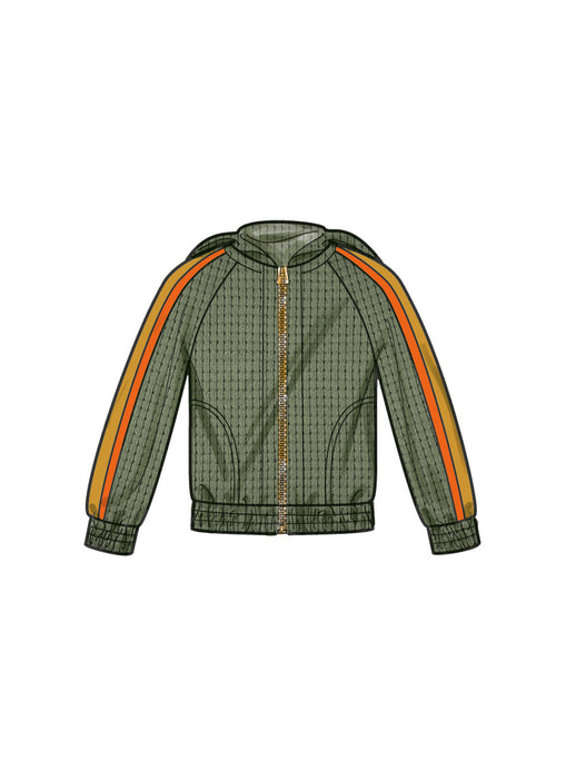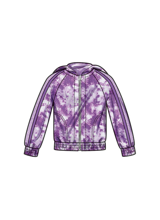 Track suit in sizes 7 to 14. Zip front hooded jacket with raglan sleeve has three contrast sleeve bands and elastic casing at sleeve and bottom hem. Wide leg track pants have stitched creases at the center front and back pocket.