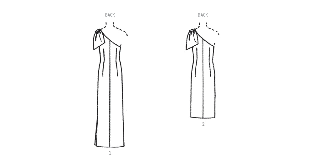 Vintage Simplicity 1960's one-piece dress in two lengths sewing pattern. Lined dress with side zipper is pleated to one shoulder over which a self-fabric bow is draped. View 1 is ankle-length dress and has left side slit. View 2 dress is regular length. Authentic Vintage Reproduction includes additional sizes and cutting layouts.
